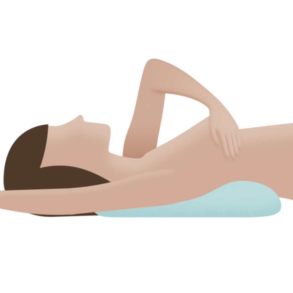 When lying down, the breast tissue spreads out evenly along the chest wall. Place a pillow under your right shoulder and your right arm behind your head. Using your left hand, move the pads of your fingers around your right breast gently covering the entire breast area and armpit.